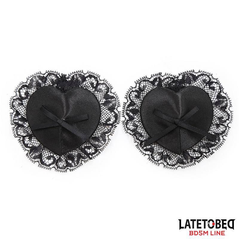 Colour: Black heart-shaped nipple shields with semi-transparent lace; Eya Silk Mask and elastic-lace Handcuffs feature coordinating black styling.