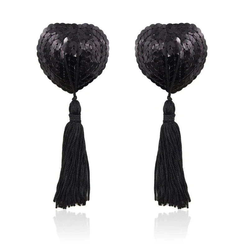 Self-Adhesive Heart Sequin Nipple Cover with Tassel Black