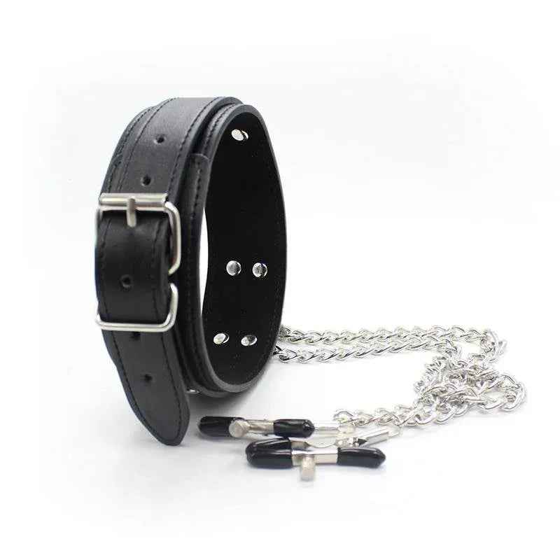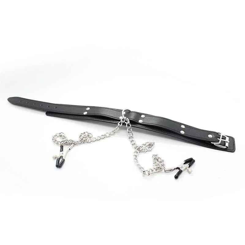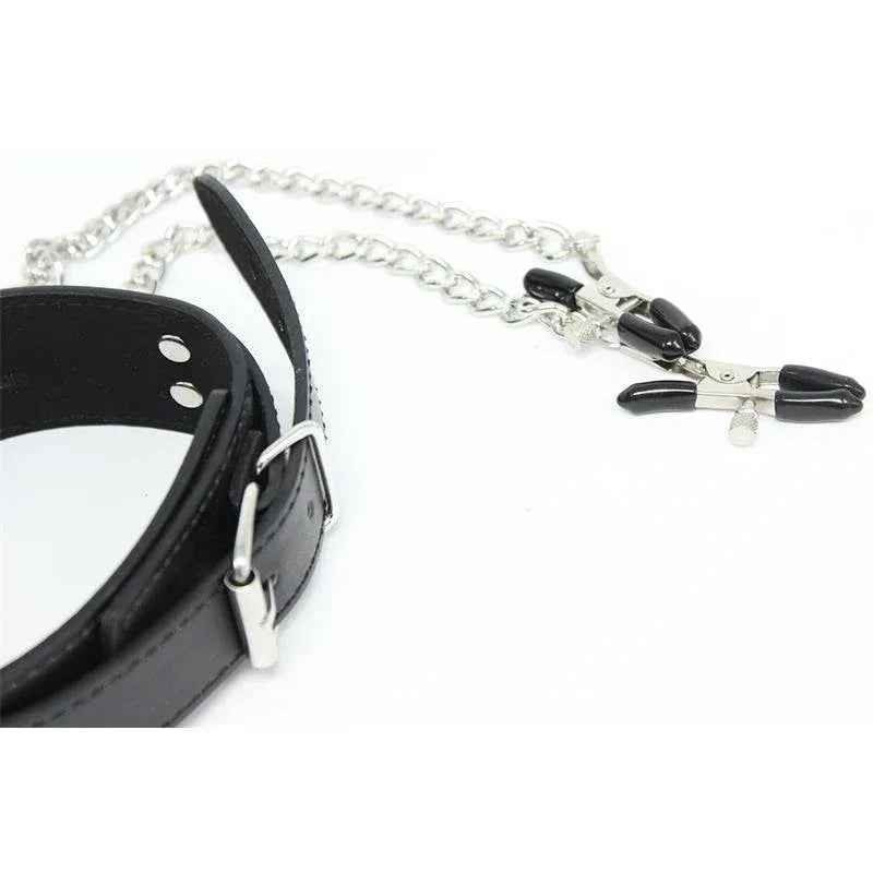 Tõstke intiimsed hetked uuele tasemele meie musta värvi kaelarihmaga, millel on nibuklambrid ja metallkett. See julge aksessuaar ühendab terava disaini ja põneva piirangu, et sütitada teie meeled ja muuta magamistoa mängu.
