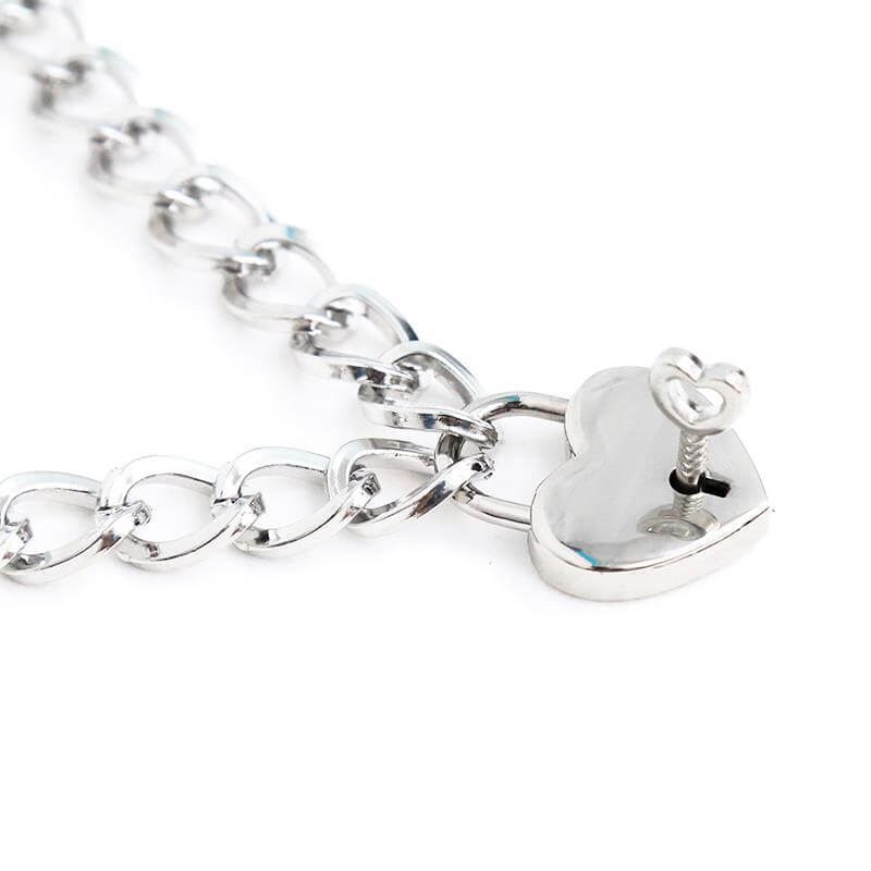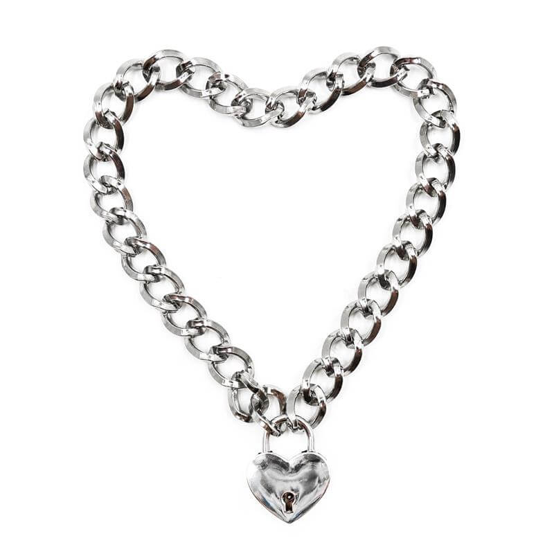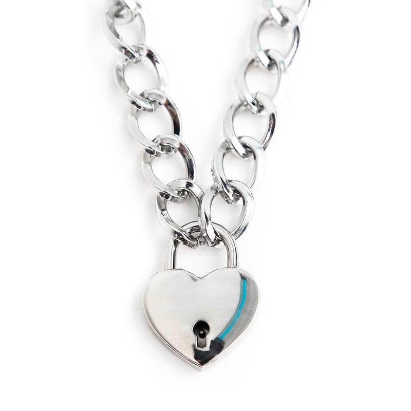 Ciesz się tym szerokim metalowym naszyjnikiem z łańcuchem. Posiada kłódkę w kształcie serca oraz klucz. Idealny prezent dla Twojej ulubionej osoby.