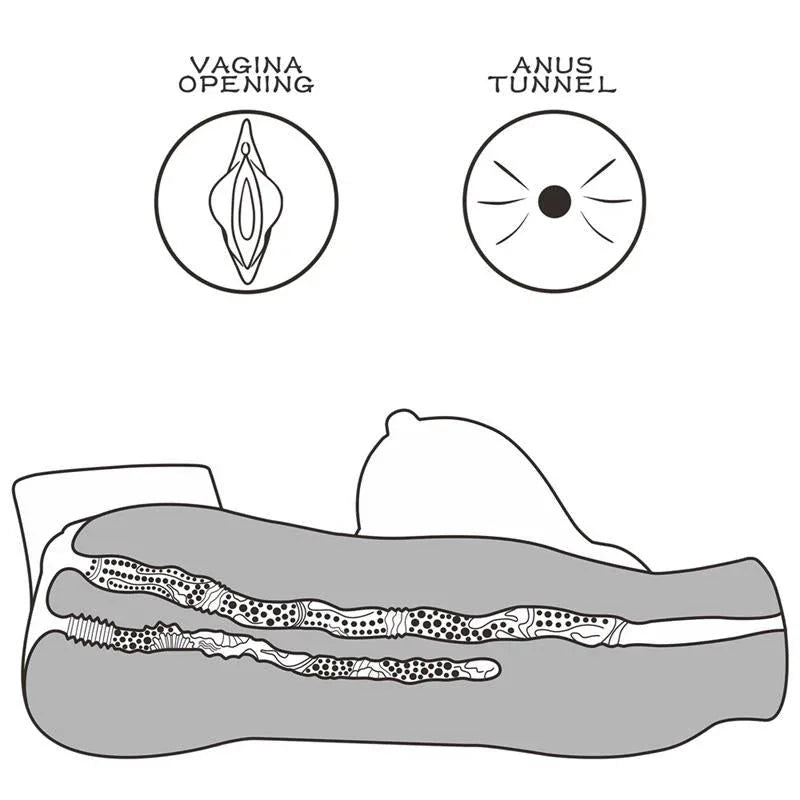 Dvojitý vstupní design nabízí odlišné cesty: vaginální tunel s hloubkou 9,4 palce a samostatný, užší anální otvor s křivkami pro různorodou stimulaci. Můžete přepínat mezi vložkami a najít tak nejpříjemnější pozice a pohyby pro prodloužené potěšení.