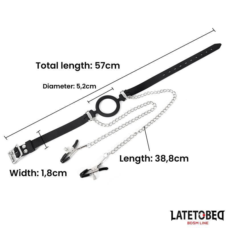 Open Mouth Gag s kolíčky na bradavky z kolekce Latetobed BDSM je odvážným přírůstkem pro milovníky intenzivních a temných požitků. Tento kroužkový roubík je plně nastavitelný díky přezkovému pásku, který zajišťuje bezpečné a pohodlné nošení během ponořující hry. Sada obsahuje potažené kryty na bradavky pro větší pohodlí a bezpečnost, které vám pomohou soustředit se na důležité pocity.