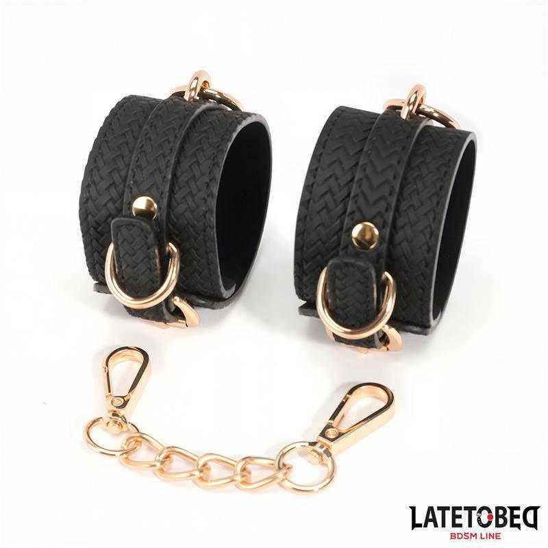 Pouta mají velmi elegantní vzor tkaní a jsou plně nastavitelná s bezpečnými přezkami. Jsou spojena zlatým řetězem pro elegantní, vysoce kvalitní vzhled, který doplňuje moderní kink hry.