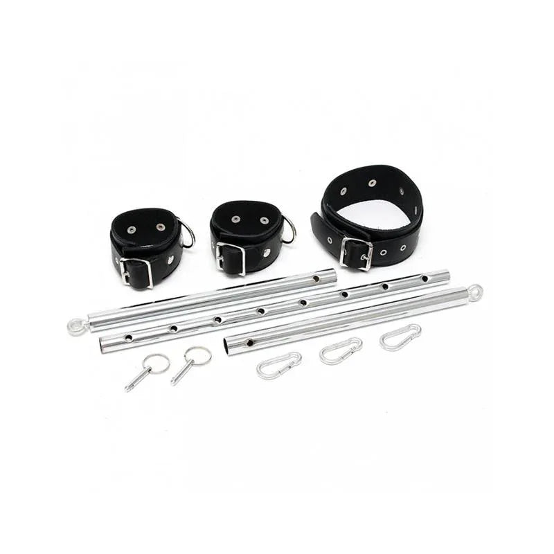 Erleben Sie eine neue Dimension der Fesselung mit dem Set Manschetten mit Spreizstange. Diese Metallstange verbindet den Hals mit den Händen über integriertes Halsband und Handschellen und bietet ein einheitliches, kontrolliertes Erlebnis. Die Verbindungen sind mit robusten Karabinern gesichert für schnellen Aufbau und Freigabe, sodass Sie in wenigen Momenten von der Vorfreude zur Aktion übergehen können. Die Stange ist in 8 Positionen verstellbar, von 55 cm bis 85 cm, sodass Sie die Länge an Ihre Größe, den Raum und Ihre Stimmung anpassen können. Gefertigt aus hochwertigem Leder und Metall, vereint dieses Set Langlebigkeit mit einem bequemen Sitz, abgeschlossen mit einer eleganten schwarz-silbernen Farbgebung, die so markant aussieht, wie sie funktioniert.