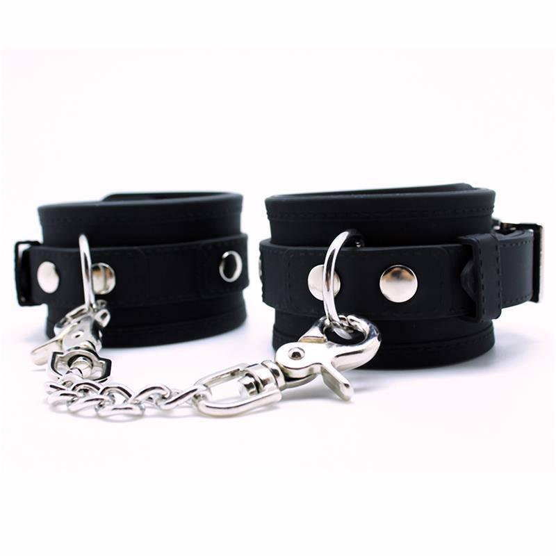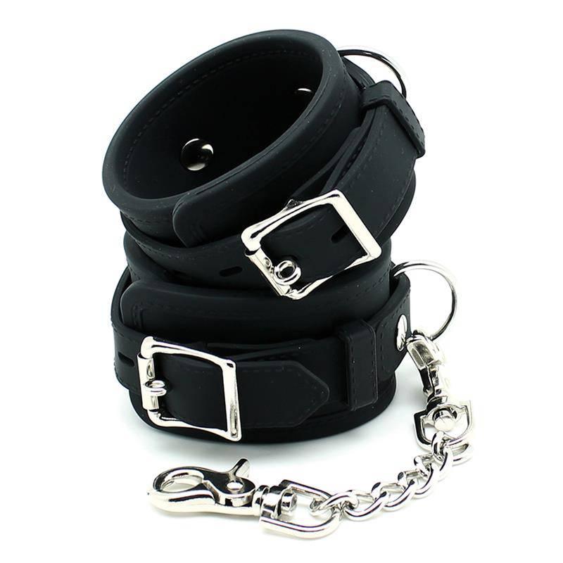 Rimba Bondage Play Silikonmanschetten zur Fixierung von Handgelenken oder Knöcheln. Diese Manschetten sind 5,5 cm breit und über Schnallen mit 5 Positionen verstellbar. Die Manschetten sind durch eine Metallkette mit Karabinerhaken an beiden Enden verbunden.