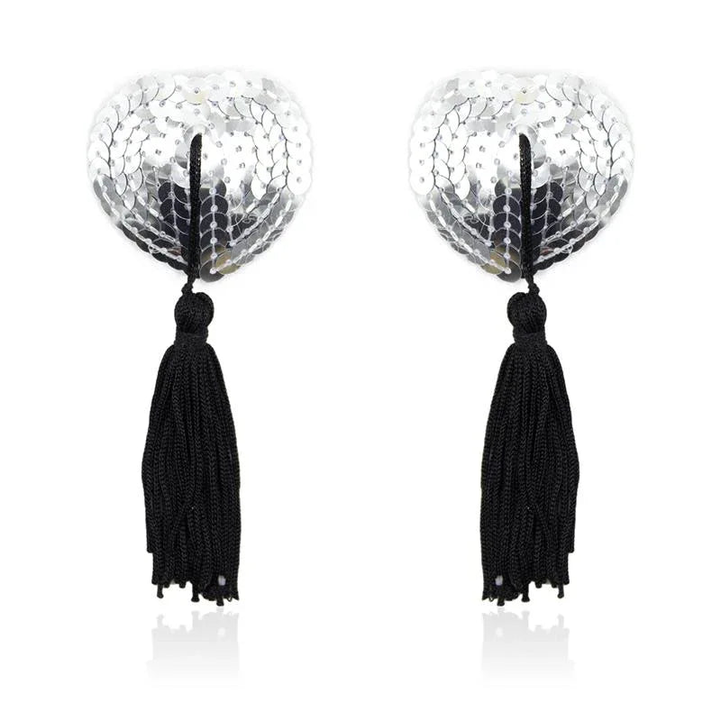 Αφεθείτε σε τολμηρό, προκλητικό στυλ με το Αυτοκόλλητο Κάλυμμα Θηλής με Καρδιά από Παγιέτες και Φούντα σε Ασημί/Μαύρο. Μέρος της σειράς Latetobed BDSM, αυτό το τολμηρό αξεσουάρ σας επιτρέπει να εξερευνήσετε τη σέξι μόδα με αυτοπεποίθηση και λάμψη.