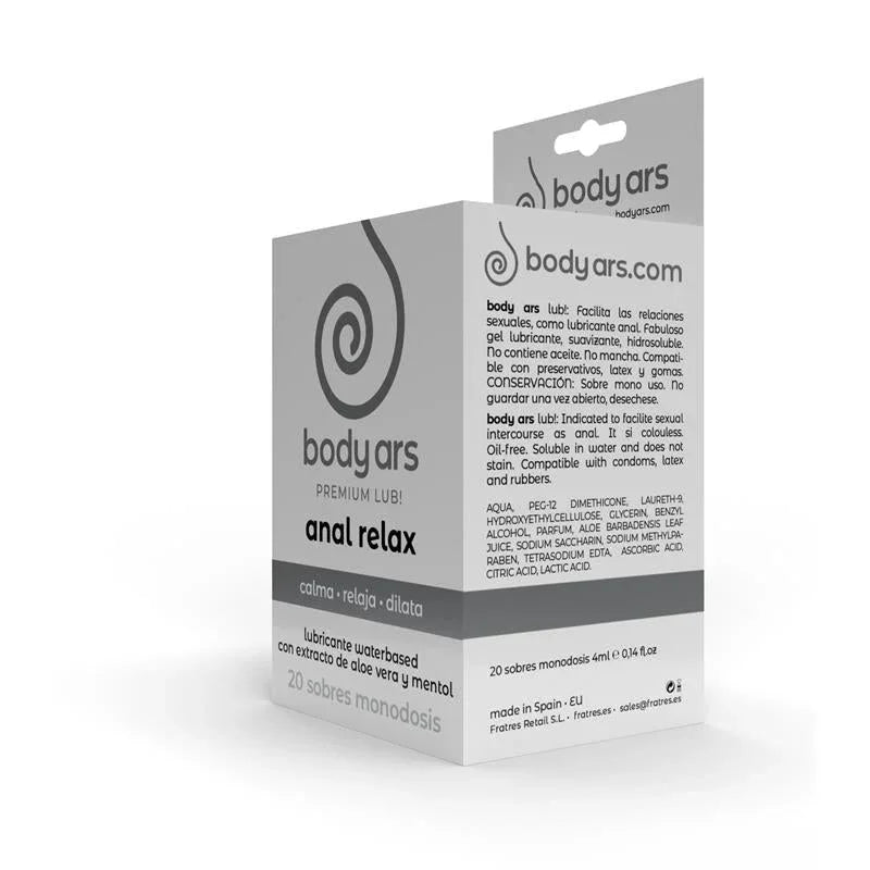 Το Body Ars anal relax gel είναι ένα υψηλής ποιότητας λιπαντικό με βάση το νερό, σχεδιασμένο να διευκολύνει το πρωκτικό σεξ χαλαρώνοντας την περιοχή, μειώνοντας την ενόχληση και προωθώντας μια ασφαλή, ευχάριστη διάταση. Περιέχει εκχυλίσματα αλόης και μέντας σε μια δροσιστική σύνθεση που προσφέρει μακράς διάρκειας ολίσθηση και αφήνει το δέρμα απαλό και μεταξένιο. Το τζελ χρησιμοποιεί φυσική, γρήγορα απορροφήσιμη βάση και είναι χωρίς λάδι, καθιστώντας το πλήρως συμβατό με προφυλακτικά λάτεξ και παιχνίδια σιλικόνης. Είναι απαλό για το ευαίσθητο δέρμα, δεν λεκιάζει και καθαρίζεται εύκολα.