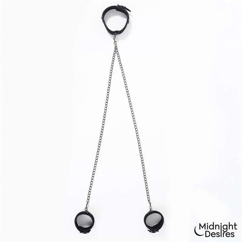 Δύο μακριές αλυσίδες που συνδέουν το κολάρο με τις μανσέτες — απρόσκοπτη σύνδεση για ελεγχόμενη συγκράτηση.