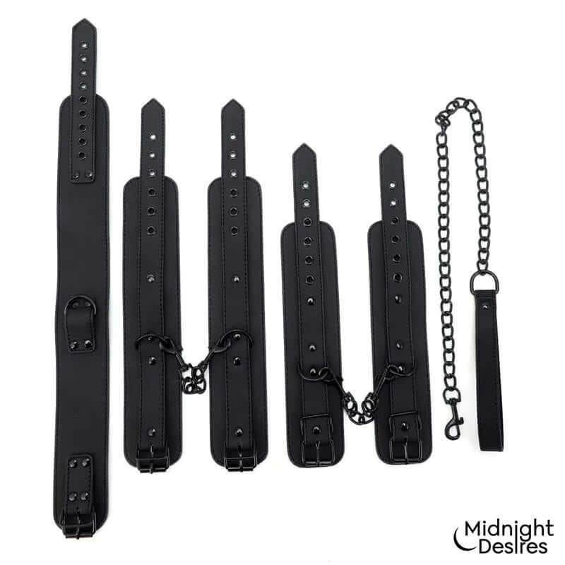 Περιλαμβάνει : ένα ζευγάρι χειροπέδες καρπού, ένα ζευγάρι χειροπέδες αστραγάλου και κολάρο με λουρί