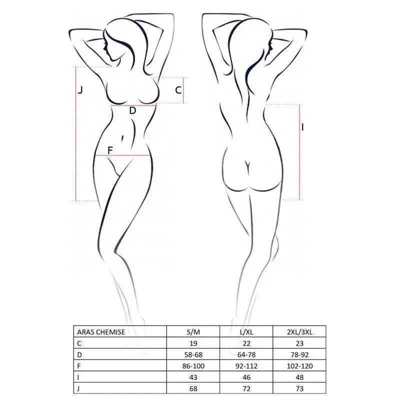 Το Aras Chemise Μαύρο είναι ένα σαγηνευτικό ημιδιάφανο χιμισέ, σχεδιασμένο για οικεία στιγμές. Αναδεικνύει τις καμπύλες με ένα λεπτό λουλουδένιο μοτίβο που διασχίζει το στήθος και κεντράρει το σώμα, και περιλαμβάνει ένα ταιριαστό μαύρο στρινγκ για ένα συντονισμένο σύνολο.