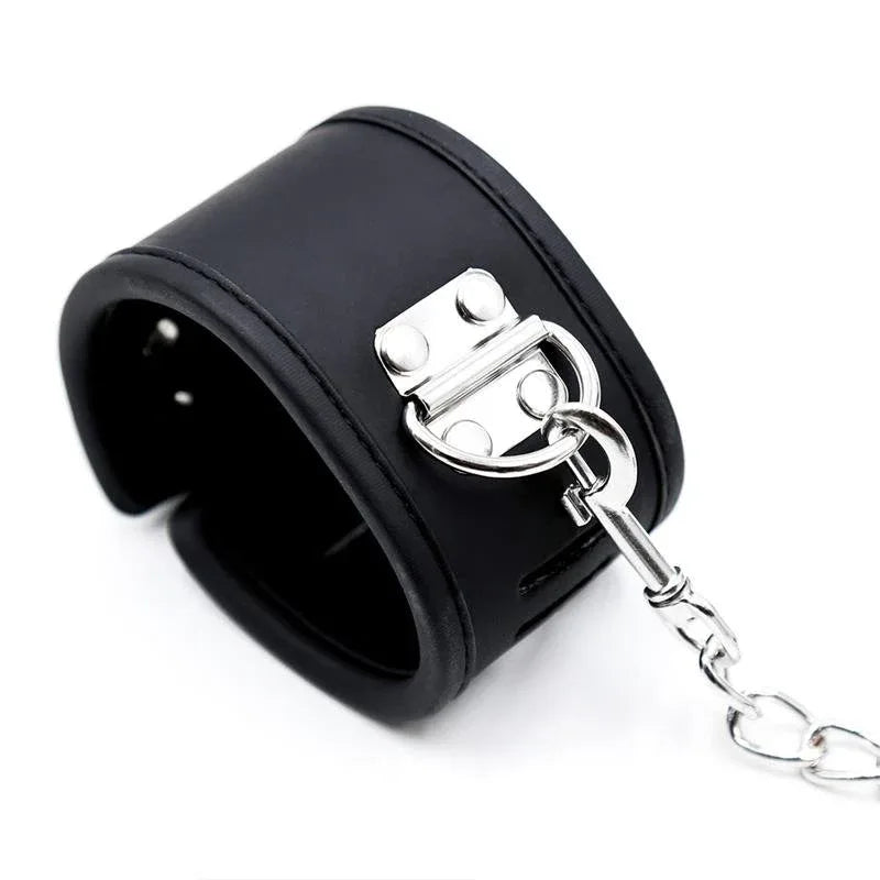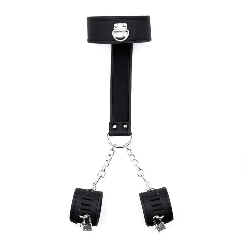 Αυτό το σετ περιλαμβάνει ένα κολάρο και χειροπέδες από vegan δέρμα. Το καλύτερο σε αυτό το σετ είναι ότι το κολάρο συνδέεται με τις χειροπέδες με μια περιοχή από το ίδιο υλικό στο πίσω μέρος, και από εκεί με μικρές αλυσίδες προς τις χειροπέδες.