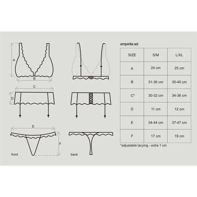 Σετ Emperita 3 Τεμαχίων Μαύρο — ένα σύνολο εσωρούχων Obsessive που ενσαρκώνει την κομψότητα, τη φινέτσα και τη σεξουαλικότητα. Κατασκευασμένο με χρόνια σχεδιαστικής εμπειρίας, αυτό το σέξι αλλά εκλεπτυσμένο σετ προορίζεται να φέρει ξανά τον ενθουσιασμό στη ζωή σας. Το σουτιέν διαθέτει ελαστική ταινία κάτω από το στήθος για επιπλέον άνεση, ενώ οι θήκες είναι από ημιδιάφανη δαντέλα με επικάλυψη βελούδου για μια πολυτελή αντίθεση.