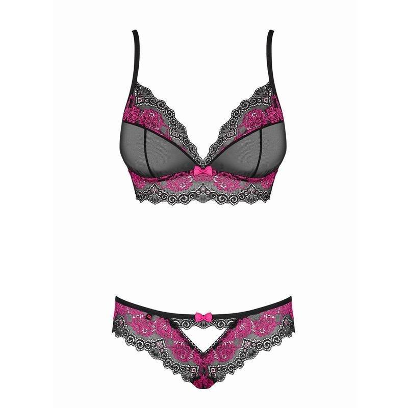 Το σετ περιλαμβάνει σουτιέν χωρίς επένδυση με λεπτές δαντελένιες λεπτομέρειες και μερικώς διαφανές κύπελλο για μια δελεαστική, παιχνιδιάρικη αποκάλυψη. Το ταιριαστό στρινγκ ολοκληρώνει την εμφάνιση, δημιουργώντας μια συνεκτική σιλουέτα που σίγουρα θα τραβήξει τα βλέμματα.