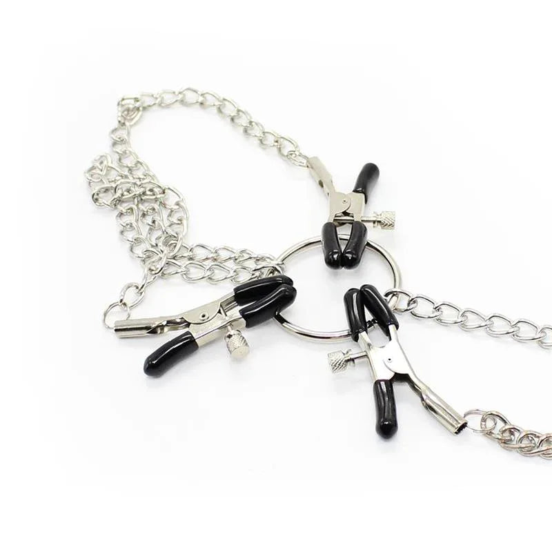 • Three metal clamps — two nipple clamps and one clit clamp — all linked by sturdy chains to a central ring.