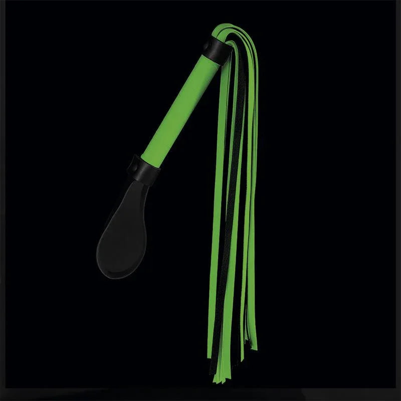 Flogger featuring a glow-in-the-dark green handle and tails; made from vegan leather, lightweight for optimal comfort.