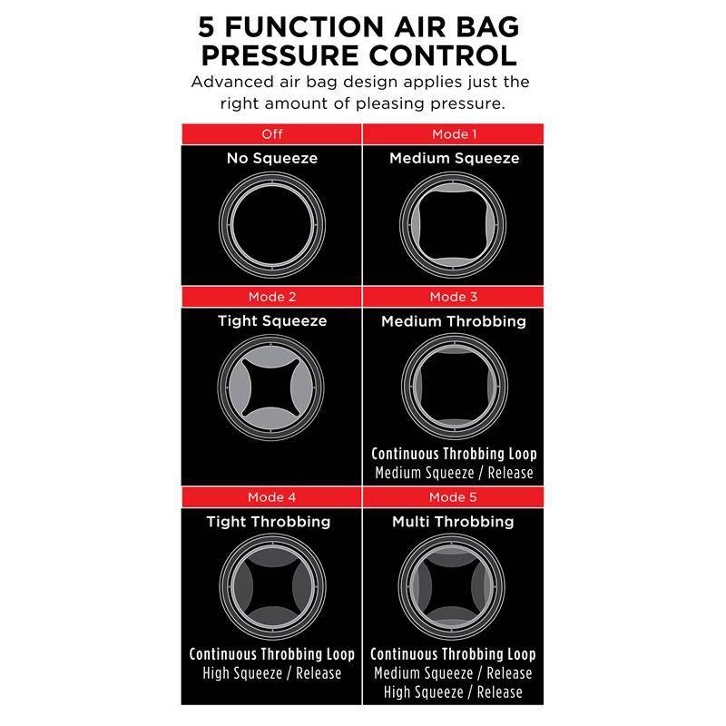 Operating Instructions: To activate the vibration fuction, press the top button once. Press again to cycle through speeds and patterns. To turn off vibration, press and hold the top button for three seconds. To active the air bag function, press the bottom button once. Press again to cycle through modes. To turn off air bags and release pressure, press and hold the bottom button for three seconds. On the back of the unit is the jackpin charging port and LED indicator. The LED will light differently depending upon the situation.
