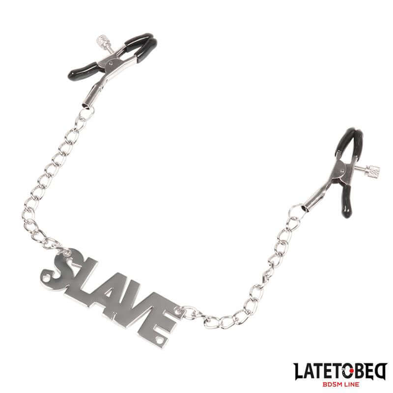 Enter the Latetobed BDSM Line with these boldly designed nipple clamps, built for players who crave intense sensation and precise control. Crafted in metal and finished for a crisp, enduring bite, these clamps deliver undeniable impact while you explore the dynamics of power and pleasure. The unmistakable presence of the word SLAVE in bold on each clamp adds a graphic, uncompromising visual to your scenes.
