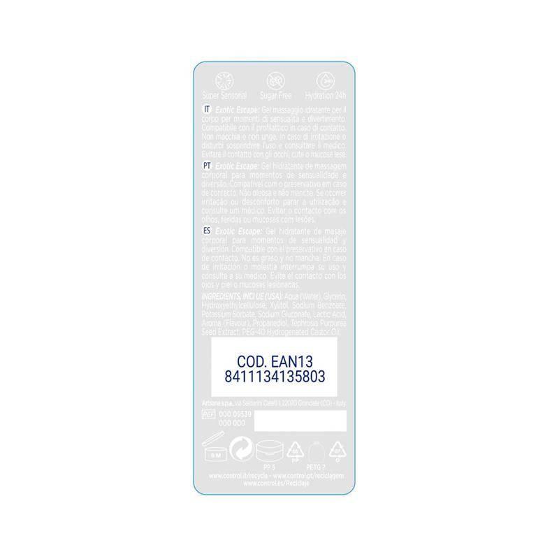 Karibian yön taika ympäröi nautinnon hetket Exotic Escapen kanssa, 2-in-1 hierontageelin, johon on lisätty Etelä-Amerikan hedelmien eksoottinen tuoksu. Sen kosteuttavat ja stimuloivat ominaisuudet edistävät hyvinvointia, rauhaa ja tasapainoa. Ihanteellinen aistillisiin koko kehon hierontoihin pehmeän ja silkkisen koostumuksensa ansiosta. Vesipohjainen ja hypoallergeeninen Exotic Escape ei tahraa, on pieninä määrinä nautittavissa turvallinen ja kondomien kanssa yhteensopiva.