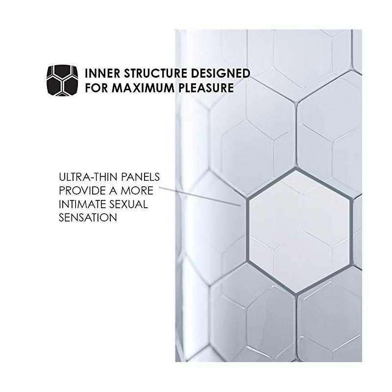 • Grâce à sa structure de 350 hexagones interconnectés, HEX permet une sensation sexuelle plus sensible et plus intime, ainsi qu’un ajustement plus sûr qui saisit délicatement le porteur pour lutter contre le glissement.