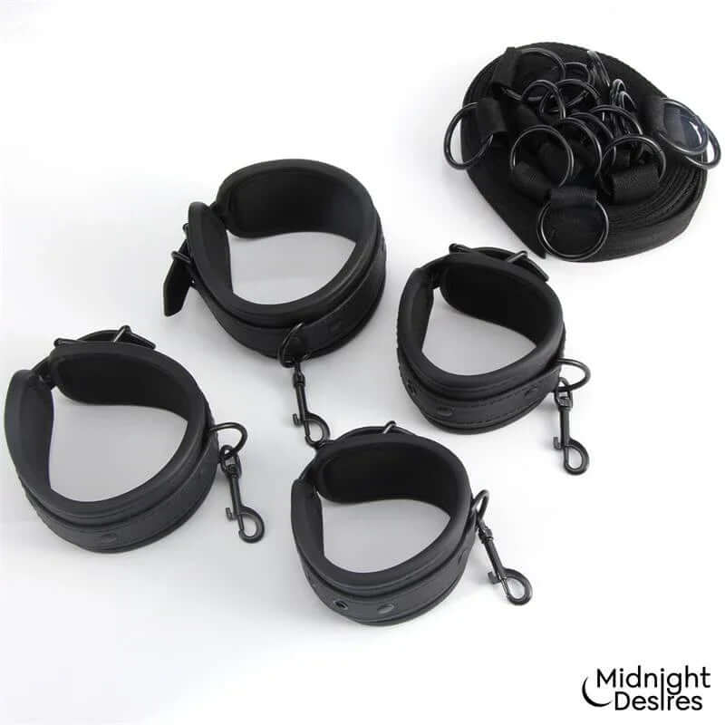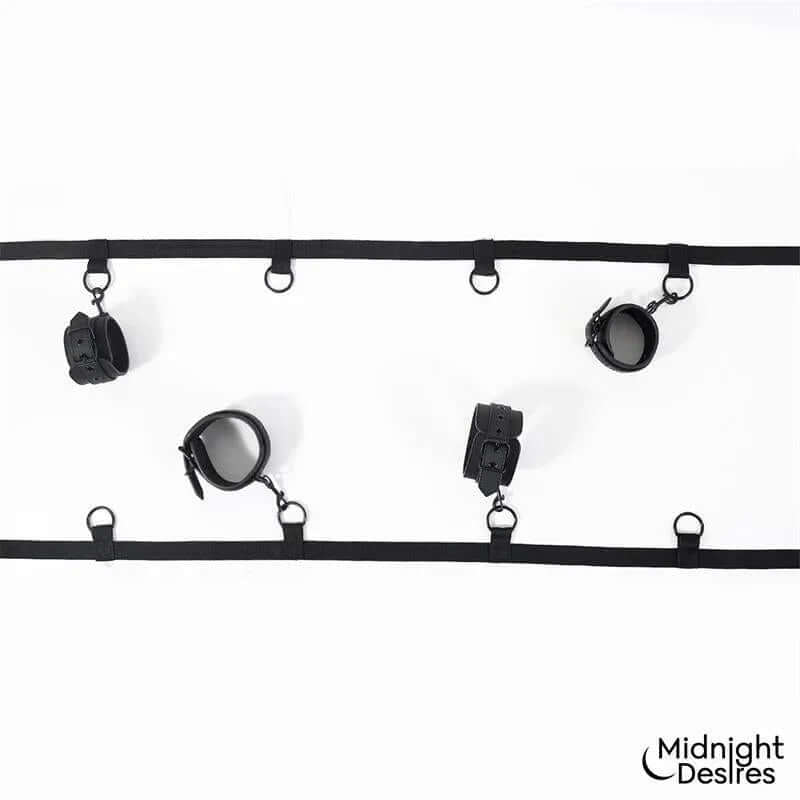 Éld át a kölcsönös beleegyezésen alapuló kötözést a Midnight Desires Ágyhoz Rögzítő Készletével – pároknak tervezve, akik mélyebb kapcsolatot és egy kis játékos irányítást keresnek. A készlet állítható pántokat és 100% vegán bőrt kombinál, hogy a legtöbb ágyon biztonságos és kényelmes illeszkedést biztosítson.