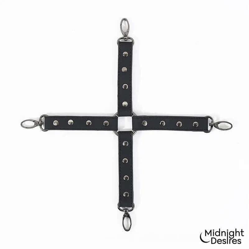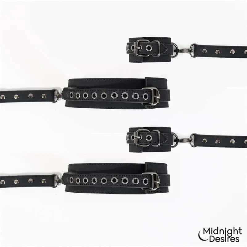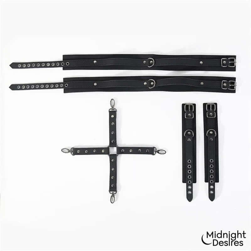 A fehérnemű és a bondage tökéletes egyesülése. Ez a szett combmandzsettákat és csuklómandzsettákat tartalmaz, melyeket keresztpántok kötnek össze. Mind a mandzsetták, mind a pántok levehetők és teljesen állíthatók csatokkal a még nagyobb kényelemért.