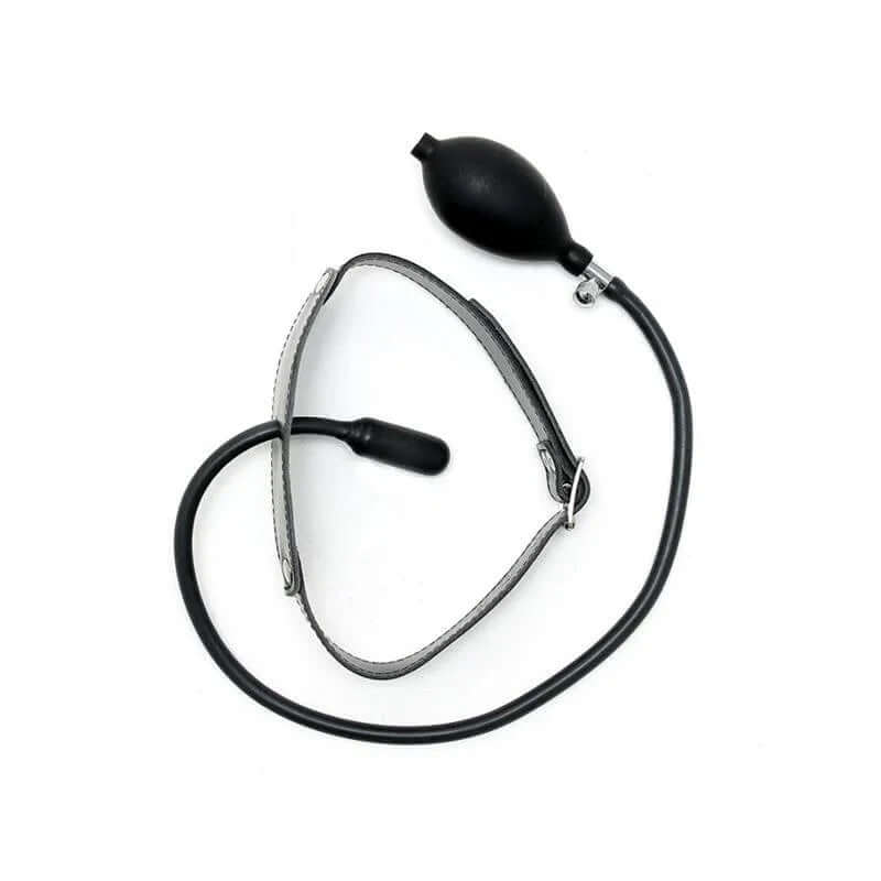 Bőr szájpeccs felfújható gömbbel és pumpával. A pántok 3 cm szélesek, és fém csattal 8 pozícióban állíthatók 45 és 58 cm között. Tökéletes a korlátok nélküli BDSM estékhez.