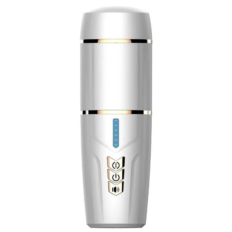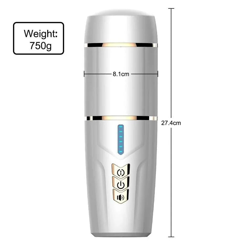Masturbatore maschile con 7 modalità e 3 velocità di movimento telescopico e rotazione. Presenta un’apertura rotonda con canale testurizzato e un design futuristico.