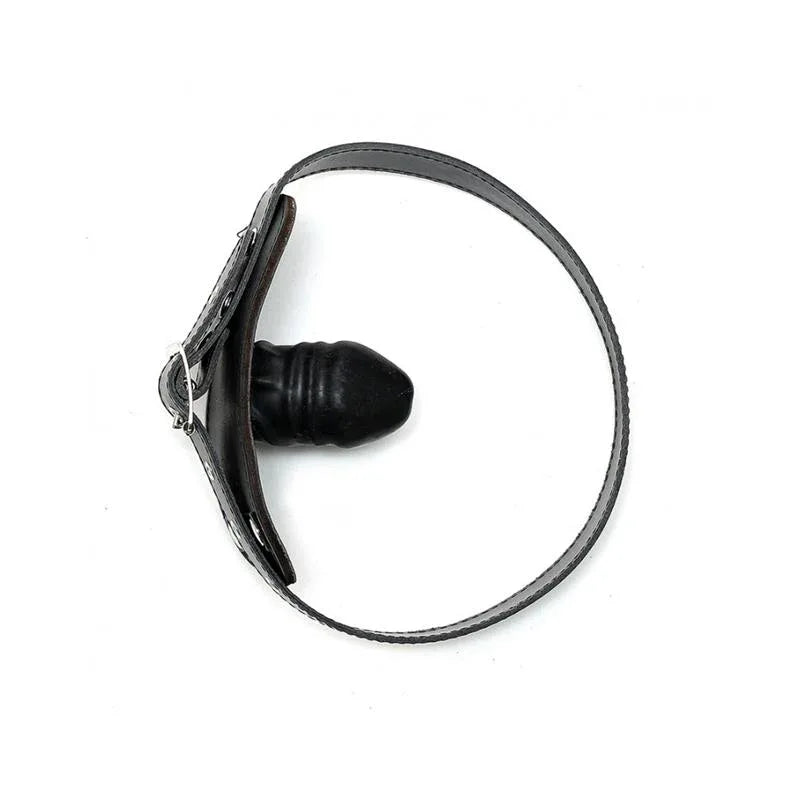 Verstelbare leren ballenstop met metalen gesp aan de achterkant. De ballenstop is een latex penis (4x6cm). Perfect om BDSM-nachten zonder grenzen te beleven.