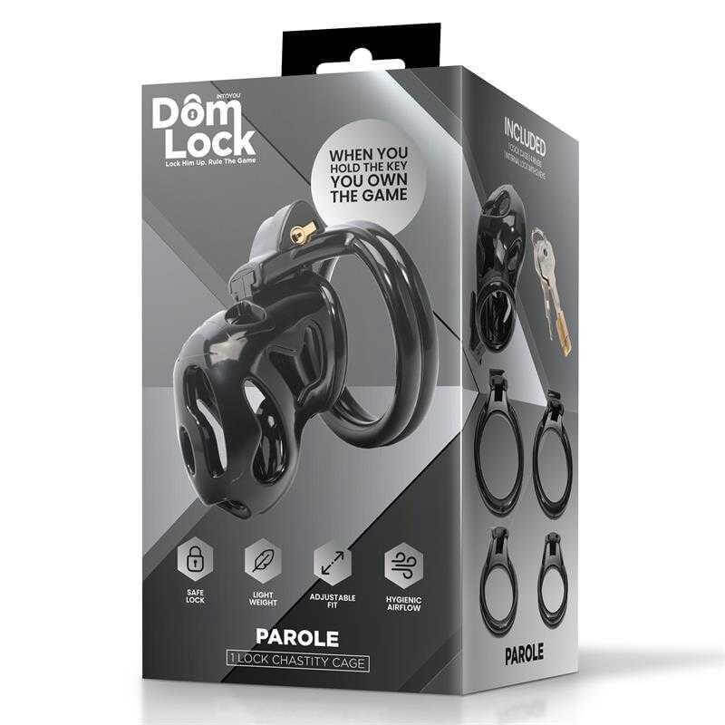 Parole to czarna klatka, która zawiera pięć pierścieni o różnych rozmiarach, dzięki czemu możesz wybierać, kiedy ich używać i cieszyć się uległością w najbezpieczniejszy możliwy sposób.