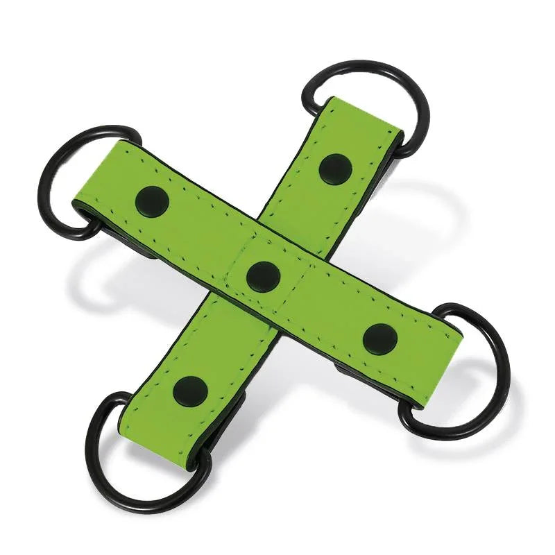 Trzymaj partnera na dystans dzięki tym kajdankom hog tie. Wykonane są z bardzo wytrzymałych materiałów wegańskiej skóry oraz mocnych metalowych pierścieni, idealnych do przypięcia ulubionych kajdanek na nadgarstki i kostki.