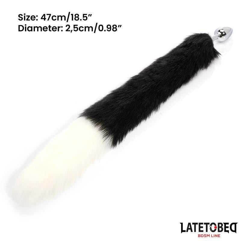 Fox Tail Análny Zátka s 40 cm Čierno-Bielym Chvostom z línie Latetobed BDSM prináša odvážnu, tmavú rozkoš pre tých, ktorí milujú intenzívne pocity. Tento kovový análny zátka kombinuje klasický tvar so zaobleným hrotom a konkávnym telom, doplnený dlhým hodvábnym chvostom na báze pre vizuálne fascinujúci a hmatovo vzrušujúci zážitok.