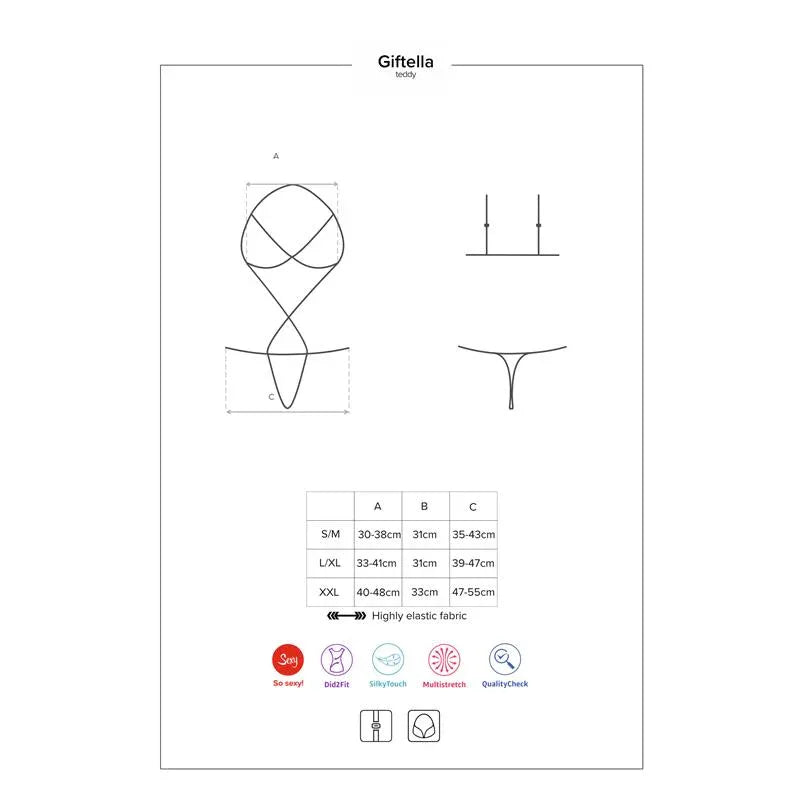 Če želite presenetiti svojega partnerja z nečim resnično erotičnim, je linija Giftella to, kar potrebujete. Globoko rdeč teddy z zelo senzualno obliko. Prsni del je zaobljene oblike, da oblikuje prsi, medtem ko je preostali del oblačila sestavljen iz trakov iste celote z lokom na delu tangic.